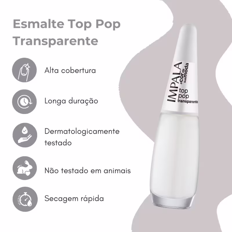 Experimente o Esmalte Impala Coleção A Cor Da Moda Top Top Transparente e arrase com unhas brilhantes, protegidas e impecáveis! Não perca essa oportunidade de garantir o toque final perfeito para suas unhas!