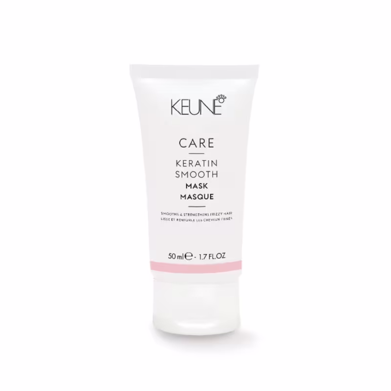 Keune Care Keratin Smooth Mask (edição Mini de 50ml, para viagens) é ideal para cabelos finos ou que passaram por processos químicos, como alisamentos definitivos e mechas, por fortalecê-los e dar brilho.