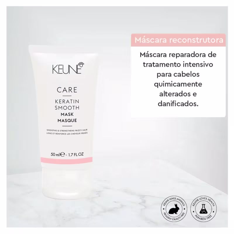 Máscara de reconstrução para cabelos com química. Keune Care Keratin Smooth Mask repõe queratina, reduz o frizz e previne a quebra.