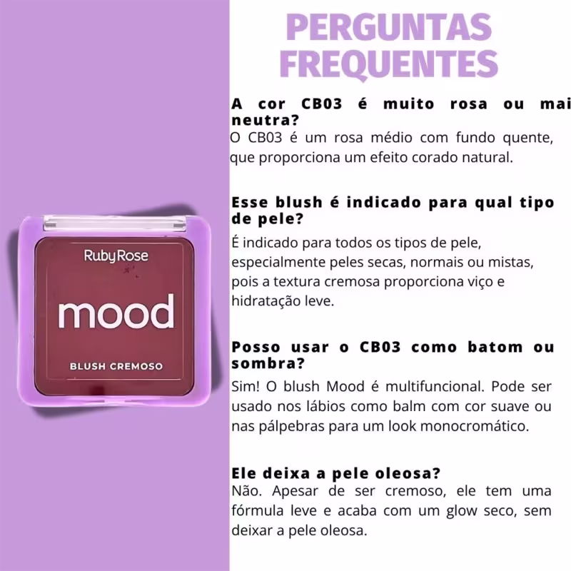 Toque de cor natural, textura cremosa e efeito saudável imediato! O Blush Cremoso Mood CB03 da Ruby Rose é aquele item coringa que transforma qualquer make com um toque de cor suave e radiante. Sua textura cremosa e fácil de espalhar proporciona um acabamento natural e luminoso, deixando as maçãs do rosto com um aspecto saudável, fresco e jovial. A cor CB03 é um rosado médio com fundo quente, ideal para criar um efeito de "coradinho natural", como se fosse um rubor real da pele. Ele se adapta a diferentes tons de pele e pode ser usado tanto no dia a dia quanto em maquiagens mais elaboradas.