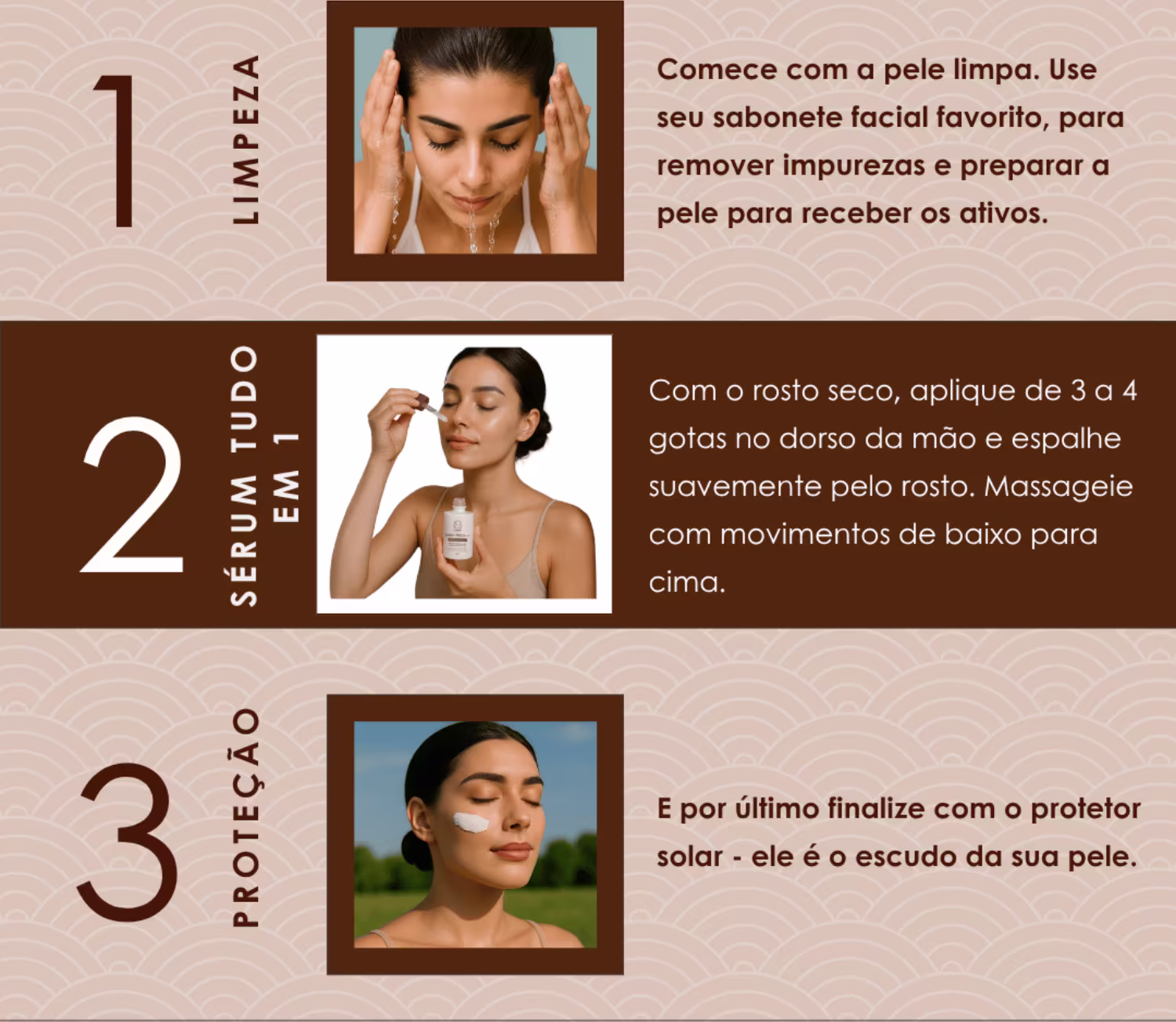 Com o rosto seco, aplique de 3 a 4 gotas no dorso da mão e espalhe suavemente pelo rosto.