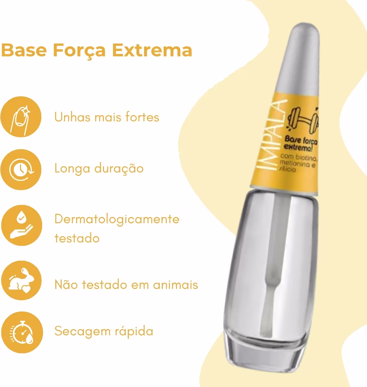 Unhas mais fortes, bonitas e protegidas desde a primeira aplicação! O Kit Esmalte Impala Base Força Extrema foi desenvolvido para quem sofre com unhas frágeis, quebradiças e precisa de um cuidado intenso e eficaz.