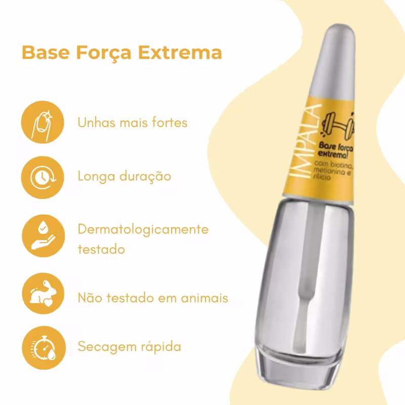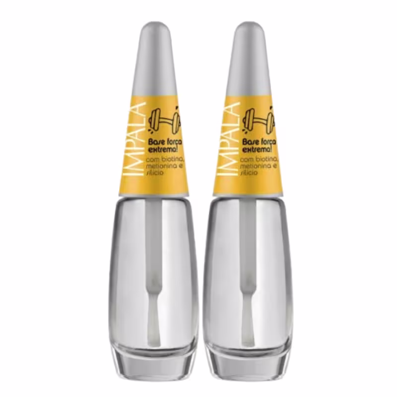 Unhas mais fortes, bonitas e protegidas desde a primeira aplicação! O Kit Esmalte Impala Base Força Extrema foi desenvolvido para quem sofre com unhas frágeis, quebradiças e precisa de um cuidado intenso e eficaz.