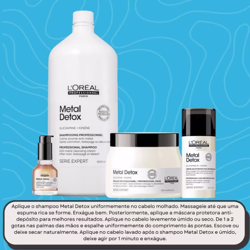 Sua fórmula inovadora ajuda a fechar as cutículas do cabelo e conferir mais resistência, o que garante mais durabilidade de cor e previne a quebra. Com o Kit L'Oréal Professionnel Metal Detox você garante efeitos satisfatórios nos processos de coloração. Além disso, protege a fibra capilar de partículas e novos acúmulos de metais após qualquer serviço de cor, mechas ou descoloração.