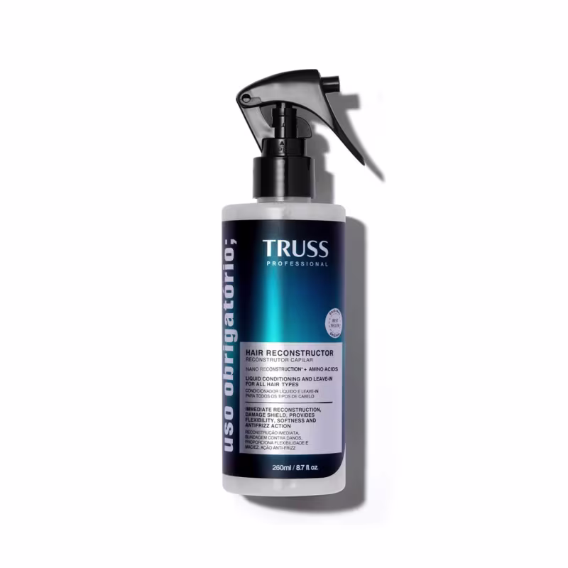 Truss Uso Obrigatório - Tratamento Líquido Reconstrutor 260ml: Borrife o spray de 2 a 3 vezes, no comprimento e pontas mecha a mecha, após o shampoo e antes do condicionador ou máscara. Massageie e enxágue para ter o efeito condicionante. Também pode ser usado como leave-in finalizador borrifando de 2 a 3 vezes no comprimento e pontas.