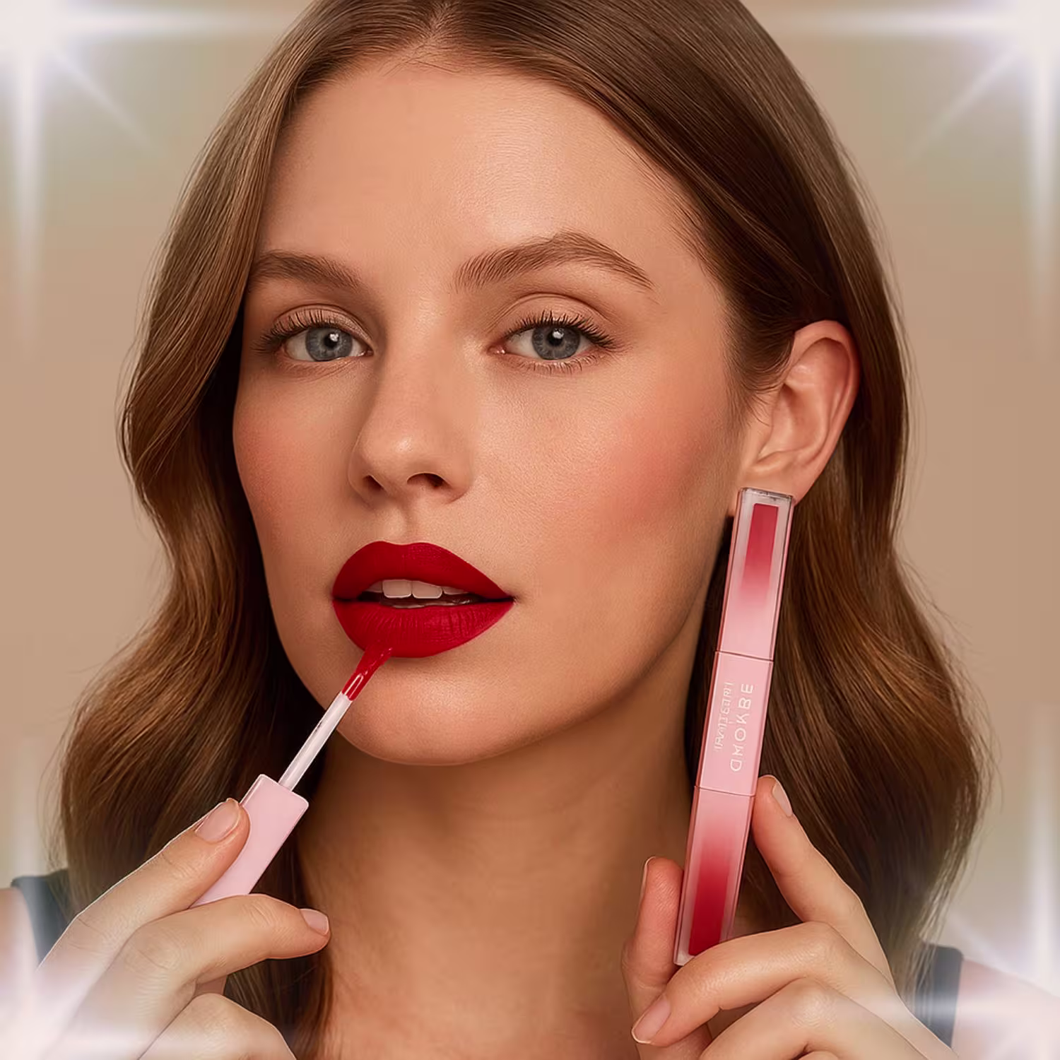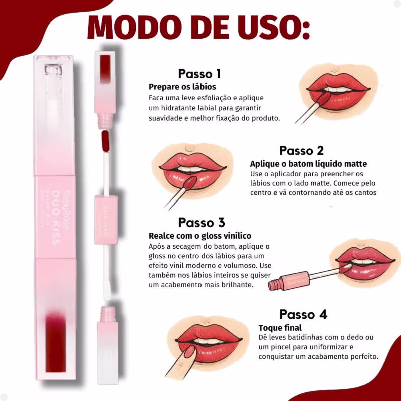 Prepare os lábios com esfoliação e hidratação. Aplique o batom nas partes superiores e inferiores dos lábios, utilizando as duas cores para criar um efeito degradê ou para destacar áreas específicas. Ajuste o acabamento aplicando camadas mais finas ou espessas, conforme o efeito desejado. Finalize dando batidinhas leves para um acabamento perfeito e retoque ao longo do dia, se necessário.