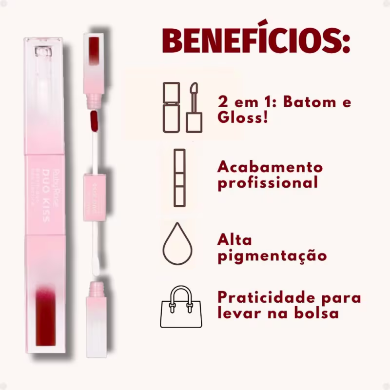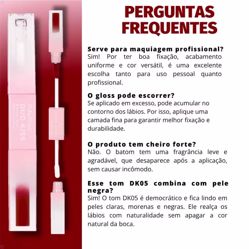 O Batom Duo Kiss DK04 da Ruby Rose foi criado para quem ama maquiagem prática, versátil e impactante. Com uma embalagem moderna e funcional de duas pontas, ele oferece batom líquido matte de alta cobertura de um lado e um gloss com brilho vinílico intenso do outro, garantindo lábios impecáveis do look básico ao super glamouroso. A cor DK04 é um rosa terroso coringa, elegante e versátil, que combina com todos os tons de pele e se adapta tanto ao uso diário quanto a produções noturnas. Ideal para dar aquele toque de confiança no dia a dia.