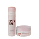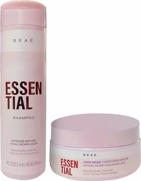 Kit com shampoo e máscara para cabelos danificados. Braé Essential Tratamento Reparador nutre e deixa os fios macios.
