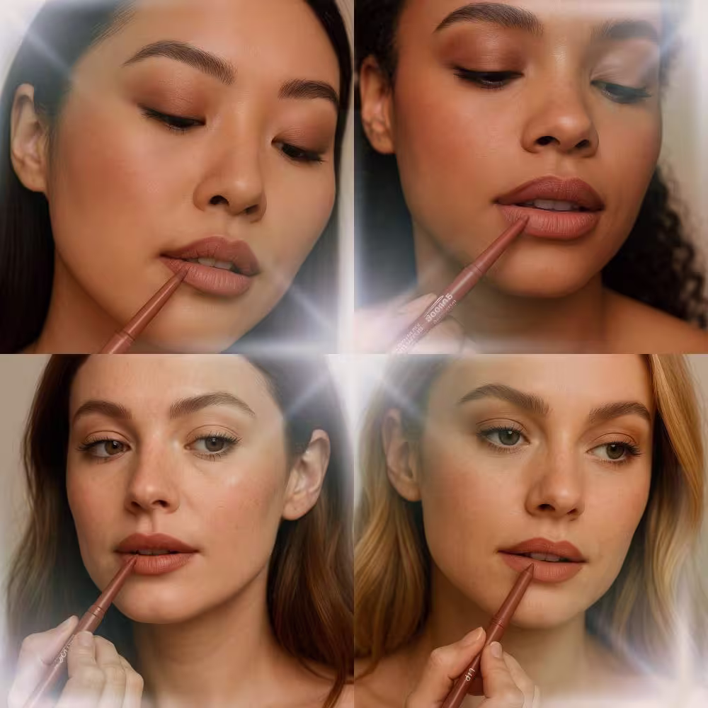 Com os lábios limpos e hidratados, contorne cuidadosamente os lábios, iniciando pelo arco do cupido e seguindo até os cantos da boca, para garantir definição e evitar que o batom escorra.