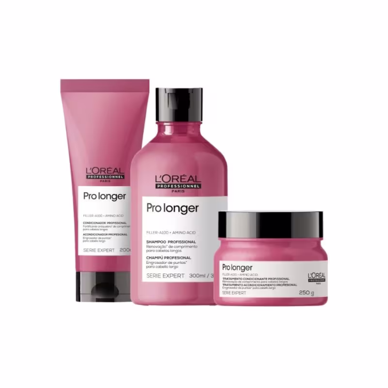 Kit L'Oréal Professionnel Serie Expert Pro Longer Preenchimento de Pontas repara as pontas duplas, proporciona 5X mais brilho, deixa o cabelo mais maleável, além de oferecer proteção térmica e ação antifrizz.