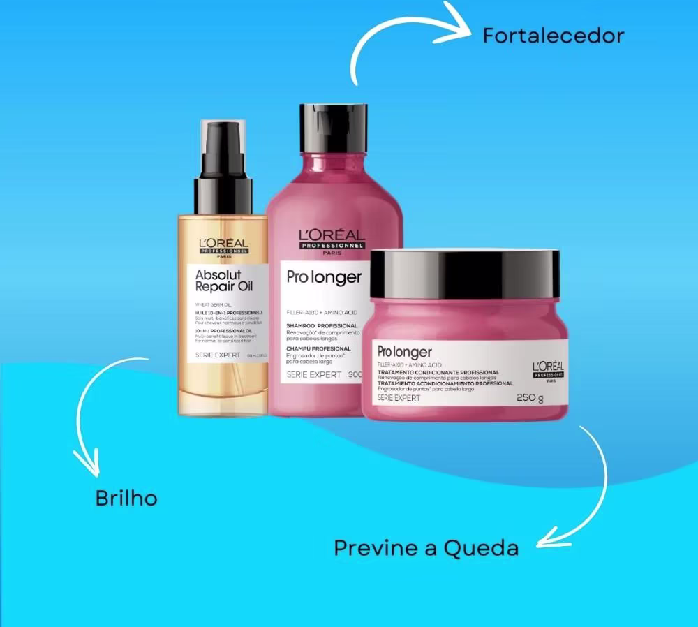 Kit L'Oréal Professionnel Serie Expert Pro Longer Preenchimento de Pontas repara as pontas duplas, proporciona 5X mais brilho, deixa o cabelo mais maleável, além de oferecer proteção térmica e ação antifrizz.