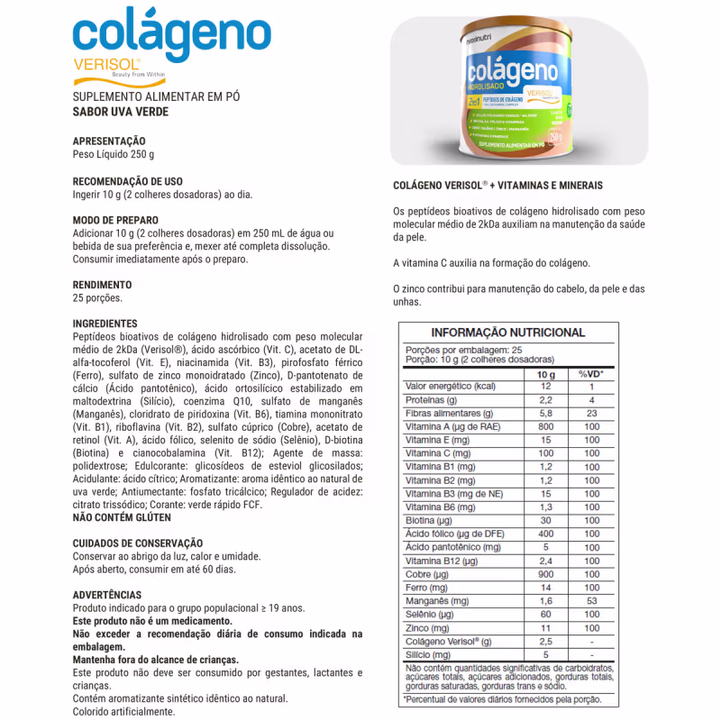 Peptídeos de colágeno (Verisol®), ácido cítrico (acidulante), citrato de sódio (regulador de acidez), polidextrose, dióxido de silício (antiumectante), mix de minerais e vitaminas: Biotina, Ácido Fólico, Ferro, Cobre, Manganês, Vitamina A, Vitamina B1, Vitamina B2, Vitamina B3, Vitamina B5, Vitamina B6, Vitamina B12, Vitamina C, Vitamina D3, Vitamina E, Selênio e Zinco, edulcorante: stevia, aroma idêntico ao natural de frutas vermelhas, corante caramelo e vermelho bordeaux. NÃO CONTÉM GLÚTEN.