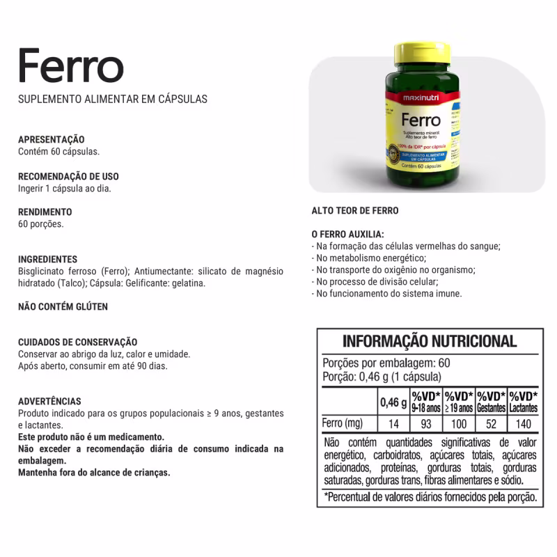 Ferro (bisglicinato ferroso), excipiente: silicato de magnésio, antiumectante: dióxido de silício, cápsula: gelatina. NÃO CONTÉM GLÚTEN.