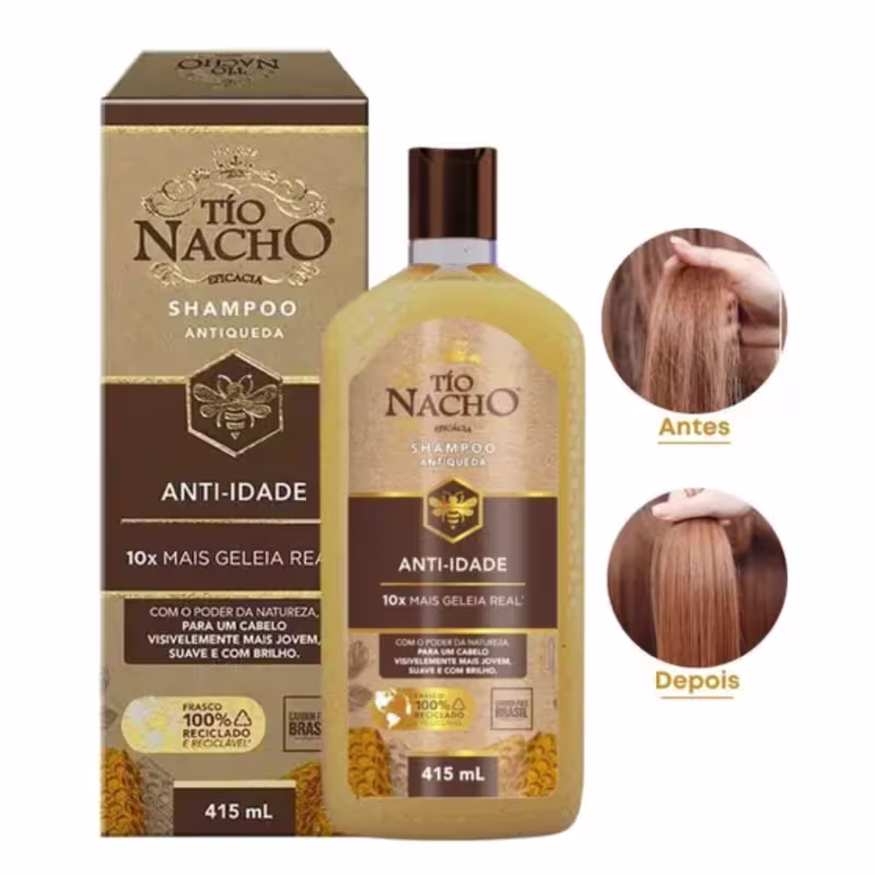 O Shampoo Tío Nacho Anti-Idade 415mL é um produto conhecido por seus benefícios para fortalecimento capilar e combate ao envelhecimento dos fios. Ele contém ingredientes naturais, como a geleia real, que nutre e revitaliza o cabelo, deixando-o mais forte e resistente.
