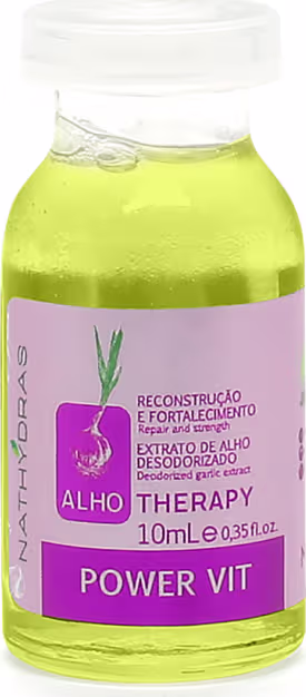 Power Vit Alho 10ml Hidratação e Nutrição Indicado para cabelos: Secos e RessecadosItens: 1 Power Vit Alho 10 mlPower Vit Alho foi desenvolvida para potencializar o tratamento de cabelos secos e quebradiços promovendo rápida reparação, nutrição e hidratação intensa aos fios. Combina queratina, Biotina e Ceramidas, D-Pantenol e Semi Di Lino que reparam os fios de dentro para fora, melhorando a elasticidade, qualidade e brilho. Essa ampola também é indicada no tratamento pós química e pós coloração para um melhor resultado de fios brilhantes e nutridos com máxima fixação e valorização da cor.Modo de uso:Power: Lave os cabelos, enxague tire o excesso de água com uma toalha, passe o produto mecha a mecha e faça uma massagem bem suave para absorver melhor. Deixe agir por 2 minutos e enxague. Você pode também usar despejando todo seu conteúdo junto a 100ml de água. Misture até obter um creme suave e aplique sobre os fios limpos e úmidos em todo o comprimento e pontas de maneira uniforme. Deixe agir por 5 minutos e enxágue. Benefícios: Nutrição, Fortalecimento e Hidratação Ativos: Queratina, Biotina, Ceramidas e D-Pantenol e Semi Di LinoResultado Esperado: Brilho, Maciez e crescimento. Precaução: Uso Externo. Mantenha fora do alcance das crianças. Em caso de alergia a qualquer um dos componentes da fórmula suspenda o uso.VALIDADE: 36 MESES