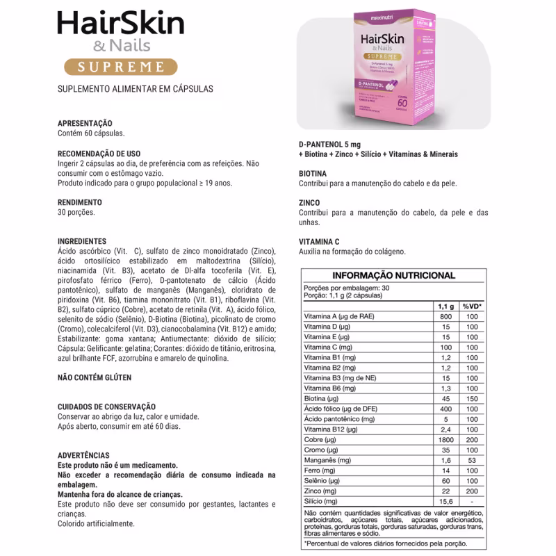 HairSkin Supreme D-Pantenol + Biotina Maxinutri 60 Cápsulas