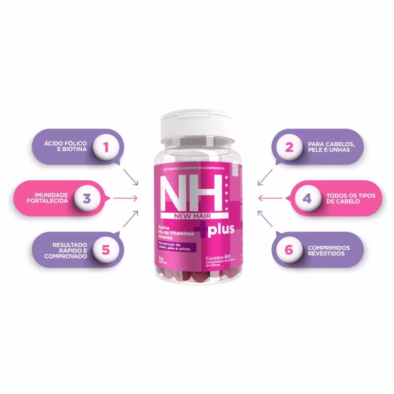 Experimente agora NH New Hair Plus e veja por si mesmo os incríveis benefícios para a saúde dos seus cabelos, pele e unhas!