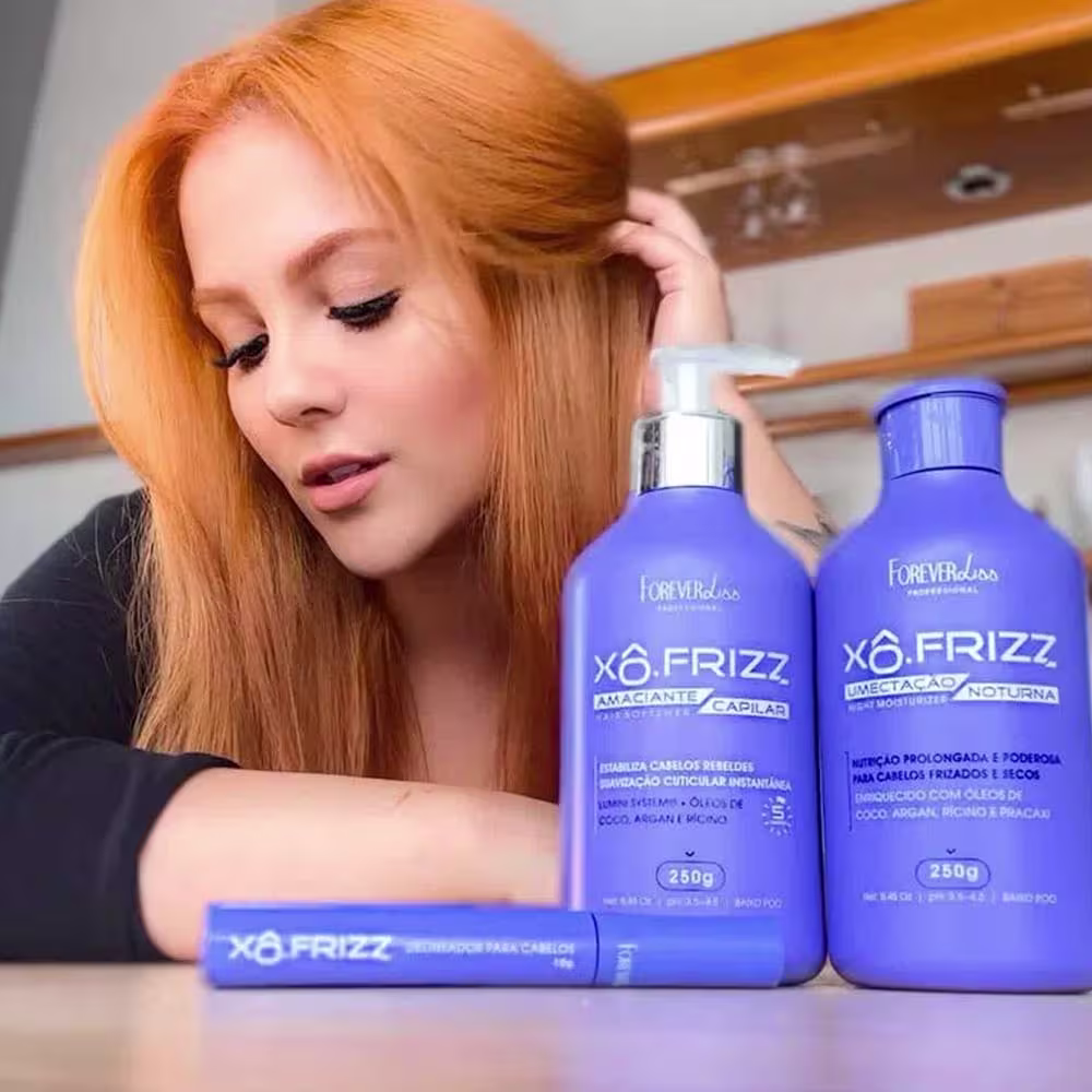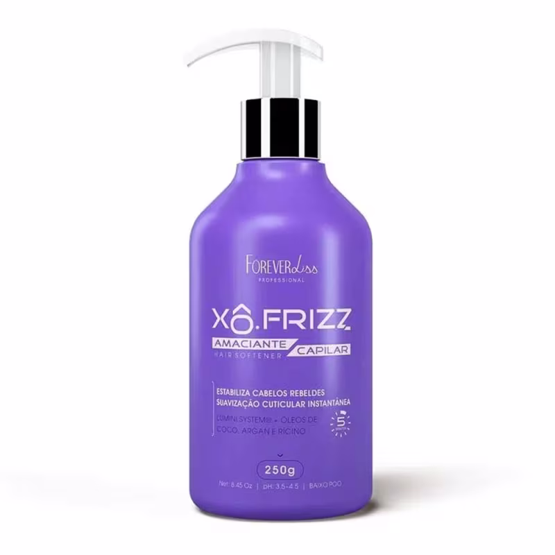 Este anuncio acompanha: 01 Amaciante Capilar Xô Frizz Forever Liss 250g ---------------------------------------------------------------------------------------- O Amaciante Capilar Forever Liss é uma verdadeira inovação para o cuidado com os fios, que estabiliza os cabelos rebeldes e acaba com o frizz de forma instantânea, sem agredir a estrutura capilar. A exclusiva tecnologia Lumini System®, presente em toda a linha Xô Frizz, combina perfeitamente com ativos encontrados na natureza, como o Óleo de Coco, com suas propriedades que contribuem para a saúde do couro cabeludo, formando uma camada protetora, o Óleo de Argan e o Óleo de Rícino que juntos promovem reparação e nutrição completa. Garante cabelos muito mais fortes, maleáveis, macios e com um efeito de brilho tridimensional, através do controle dos fios rebeldes, deixando-os livres de frizz instantaneamente. Indicação Indicado para todos os tipos de cabelo para o controle do frizz e a suavização da superfície dos fios. Tecnologia Óleo de Coco: Garante mais saúde capilar, através de propriedades antibacterianas, além de criar uma camada de proteção extra para os fios. Óleo de Argan: Contribui no controle do frizz, selando as cutículas e promovendo hidratação completa. Óleo de Rícino: Proporciona um crescimento ainda mais saudável, com fios mais fortes, maleáveis e macios, com controle de frizz. Lumini-System®: Ativo inteligente capaz de promover a texturização dos fios, reduzindo o frizz de forma instantânea. Benefícios Suavização da superfície do fio Fortalecimento Alinhamento dos fios Eliminação da estática Hidratação e nutrição Exclusiva tecnologia Lumini-System® Redução de frizz instantânea Menos volume Cabelos mais saudáveis Modo de uso 01. Após lavar os cabelos, retire o excesso de água e aplique o Amaciante Capilar no comprimento e pontas; 02. Massageie mecha a mecha; 03. Deixe agir por 5 minutos; 04. Enxágue completamente; 05. Finalize como desejar. Resultado Cabelos altamente macios, alinhados e sem frizz. O resultado do produto pode variar de acordo com o estado e condições de cada tipo de cabelo.
