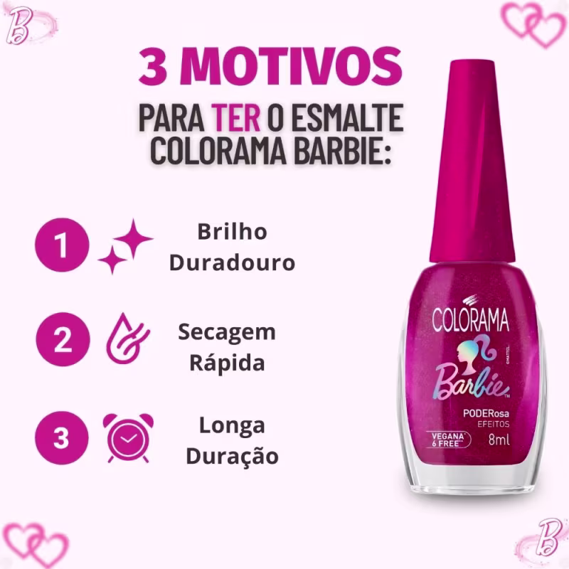 O Esmalte Efeitos Colorama Barbie PODERosa 8ml é a escolha ideal para expressar sua individualidade e realçar sua beleza com um toque de magia. Inspirado na icônica Barbie™, este esmalte captura a essência do poder feminino, oferecendo uma tonalidade vibrante e um brilho deslumbrante que transformam suas unhas em verdadeiras joias. Ideal para mulheres que desejam unhas impecáveis e cheias de personalidade, este esmalte proporciona alta cobertura, um acabamento cintilante uniforme e um brilho duradouro, elevando seu estilo a um novo patamar.