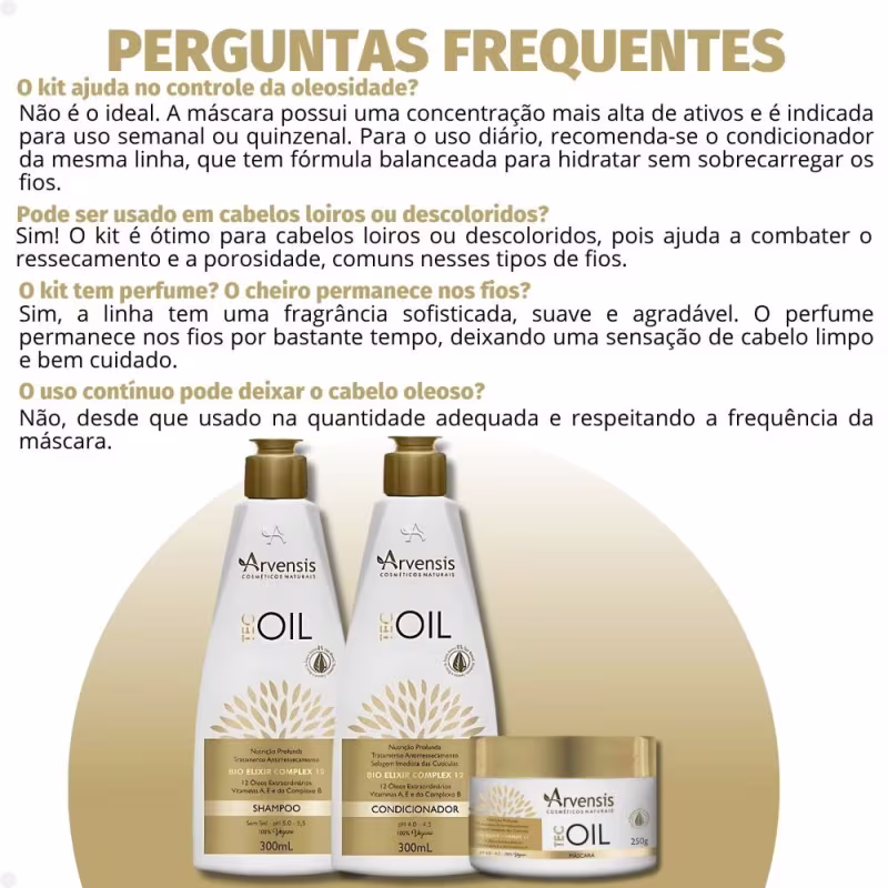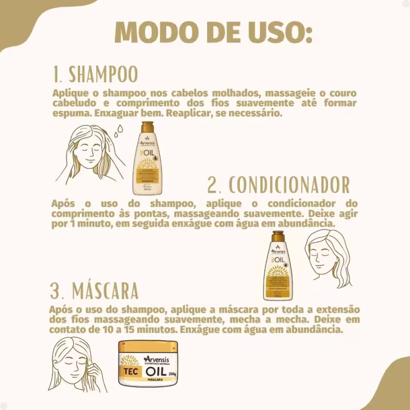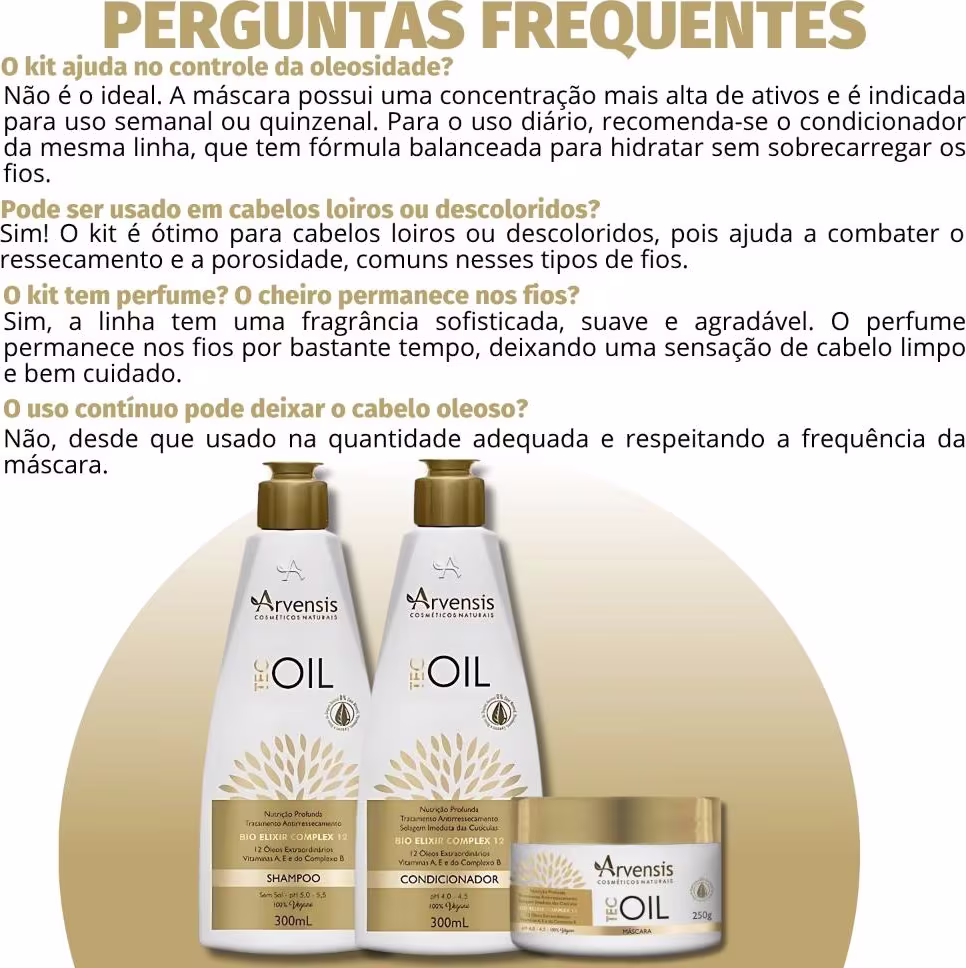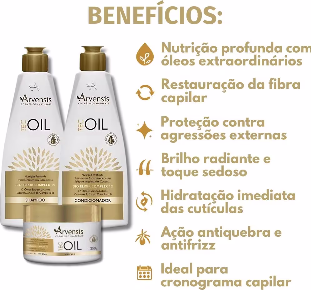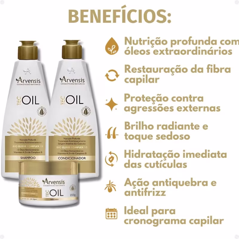 O Kit Arvensis Tec Oil é um sistema completo de tratamento capilar, cuidadosamente desenvolvido para restaurar profundamente a saúde dos cabelos secos, danificados, porosos ou quimicamente tratados. Composto por Shampoo 300ml, Condicionador 300ml e Máscara de Tratamento 250g, o kit oferece uma rotina completa de cuidados, com alto poder nutritivo e reparador. Sua fórmula é enriquecida com uma combinação exclusiva de óleos nobres, como Óleo de Argan, Óleo de Ojon e Óleo de Macadâmia, ingredientes reconhecidos por sua ação antioxidante, reconstrutora e altamente emoliente. Esses ativos atuam diretamente na fibra capilar, restaurando a estrutura dos fios, selando as cutículas e devolvendo o brilho e a elasticidade natural dos cabelos. Ideal para quem deseja recuperar os danos causados por químicas, colorações, uso constante de fontes de calor ou agressões externas como sol, vento e poluição, o Kit Tec Oil proporciona uma transformação visível desde a primeira aplicação: fios mais fortes, sedosos, disciplinados e com brilho espelhado.
