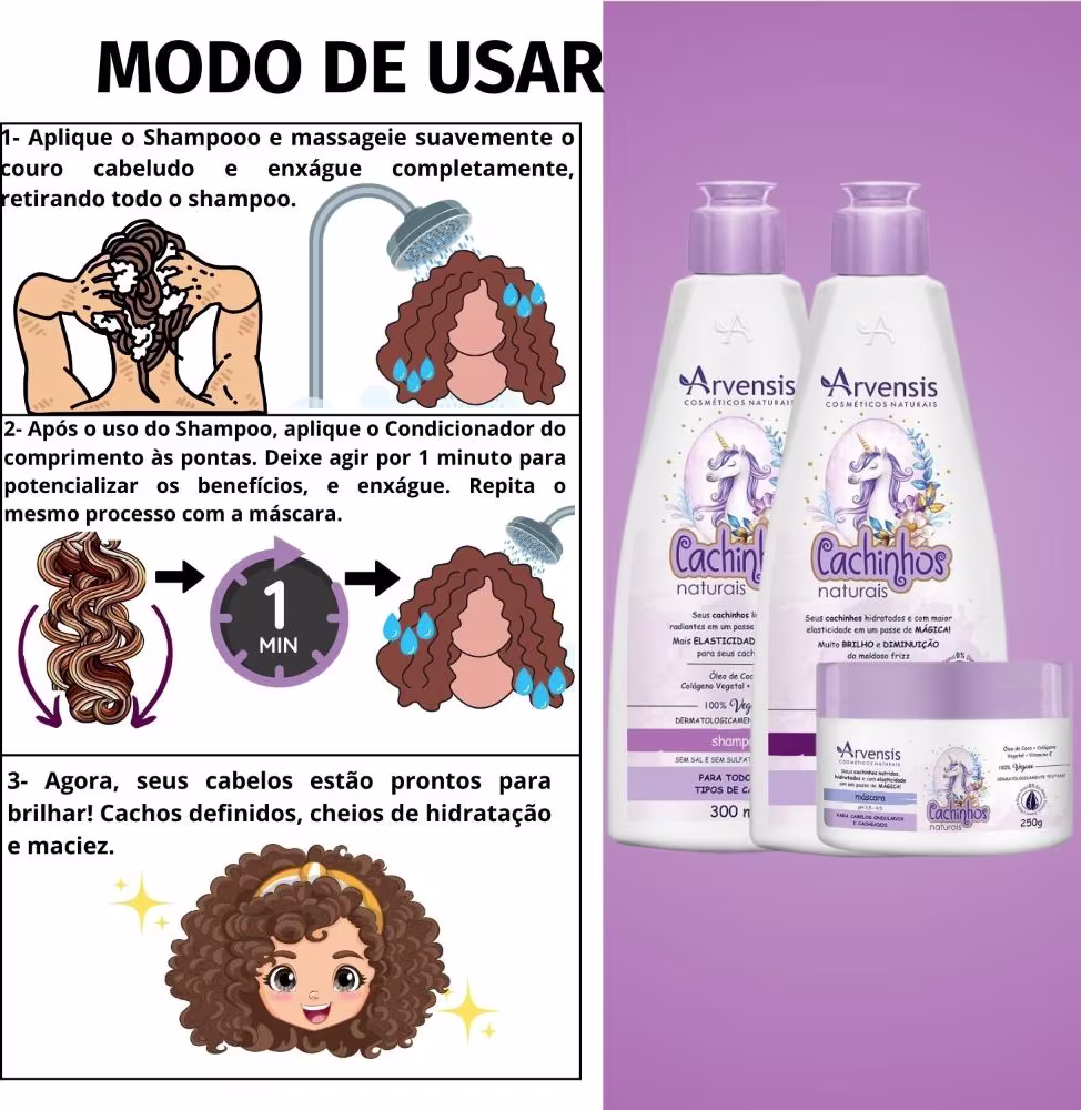 Shampoo: Aplique o shampoo nos cabelos molhados, massageie o couro cabeludo e comprimento dos fios suavemente até formar espuma. Enxaguar bem. Reaplicar, se necessário.