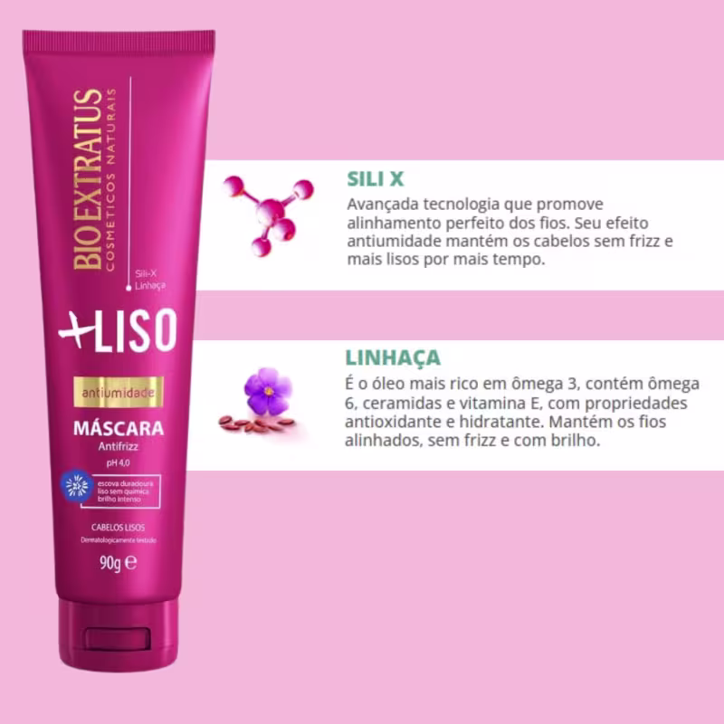 A Máscara Antiumidade +Liso 90g da Bio Extratus é um produto capilar desenvolvido para quem busca cabelos mais lisos, disciplinados e sem frizz. Formulada com ingredientes naturais, sua principal função é criar uma barreira antiumidade, protegendo os fios contra os efeitos do ambiente, como frizz e excesso de volume.