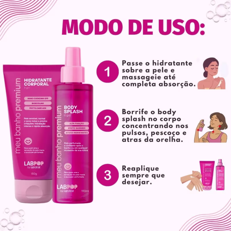 Hidratante Corporal: Aplique na pele limpa e seca após o banho, massageando suavemente até completa absorção do produto.