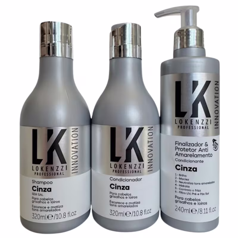 Após molhar os cabelos aplique o shampoo por todo o cabelo. Deixe de 3 a 5 minutos e enxágue. Para melhores resultados use também o Condicionador Cinza Lokenzzi.