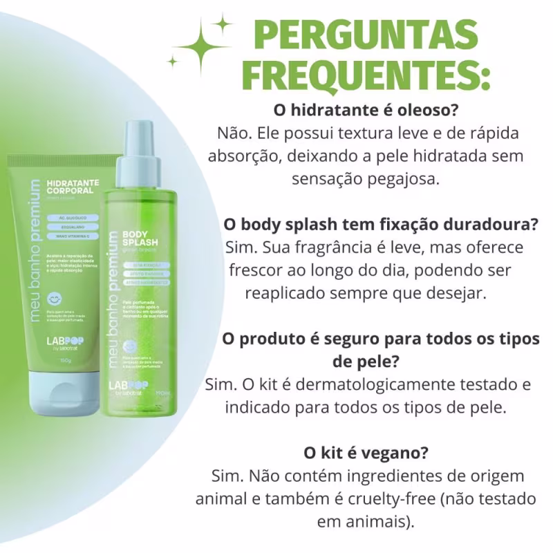 Sinta a brisa da natureza em sua pele com o Kit LabPop by Labotrat Green Breeze. Este kit é a solução ideal para quem busca hidratação e frescor em um só produto, combatendo o ressecamento e proporcionando uma sensação de bem-estar duradoura. Com o hidratante corporal e o body splash, sua pele fica macia, perfumada e revitalizada, transportando você para um jardim florido a cada aplicação. Ideal para todos os tipos de pele, este kit oferece uma experiência sensorial única, cuidando da sua pele intensamente e garantindo um toque suave e refrescante ao longo do dia. Experimente o poder da natureza com LABOTRAT!