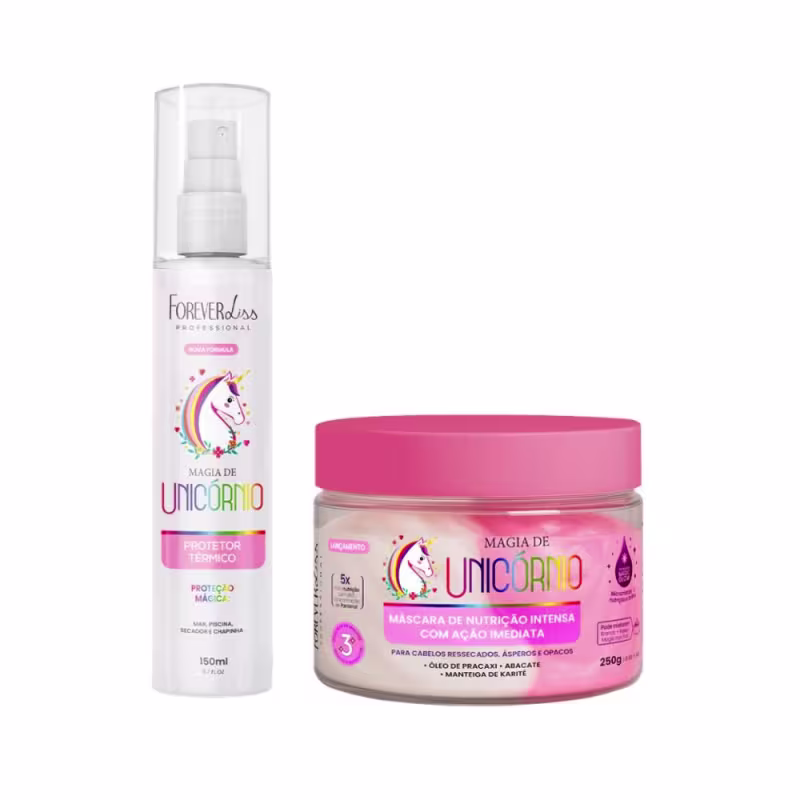 O Kit Magia de Unicórnio Forever Liss é indicado para todos os tipos de cabelo, especialmente os ressecados, opacos, danificados ou ásperos. Ideal para quem busca nutrição intensiva, proteção térmica e brilho espelhado, com resultados imediatos e fios revitalizados.