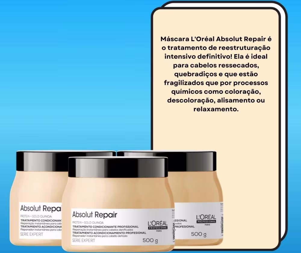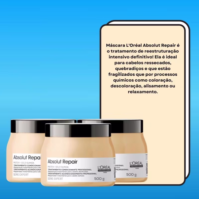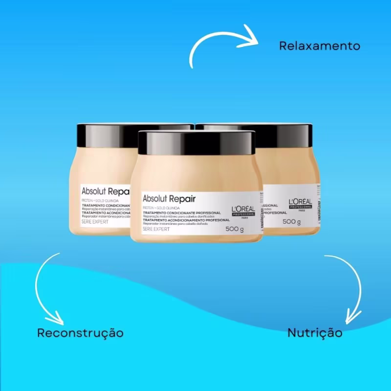 Restauração Completa com Quinoa e Proteínas:A Máscara L'Oréal Professionnel Absolut Repair Gold Quinoa tem como objetivo reparar intensamente a fibra capilar extremamente fragilizada, promovendo uma restauração completa dos fios.