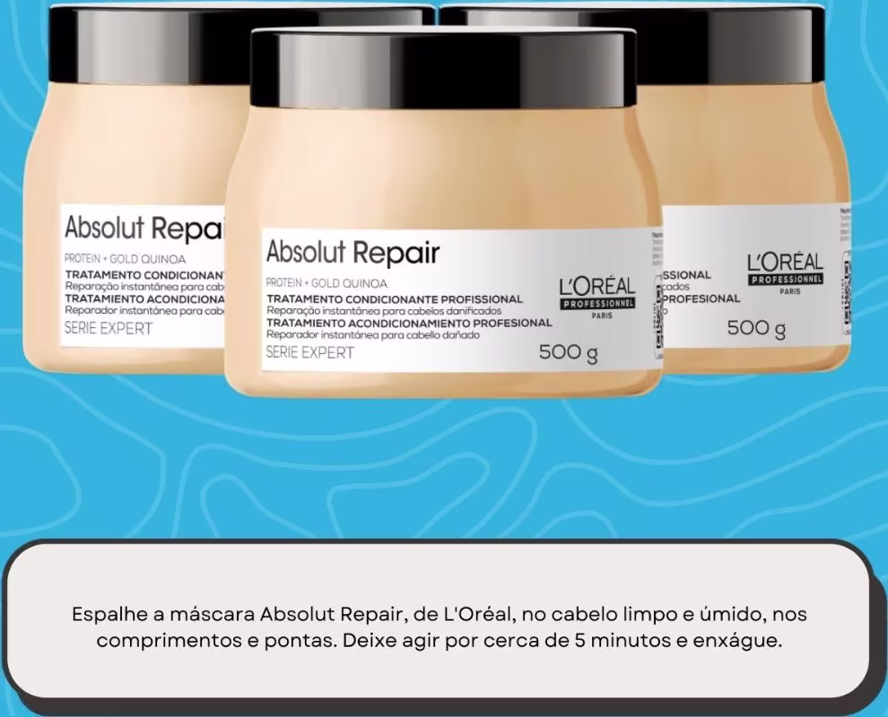 Não deixe de experimentar também o Leave-in L'Oréal Professionnel Serie Expert Absolut Repair Gold Quinoa + Protein 10 in 1, que ajudará a intensificar a restauração e o brilho em seus cabelos danificados.