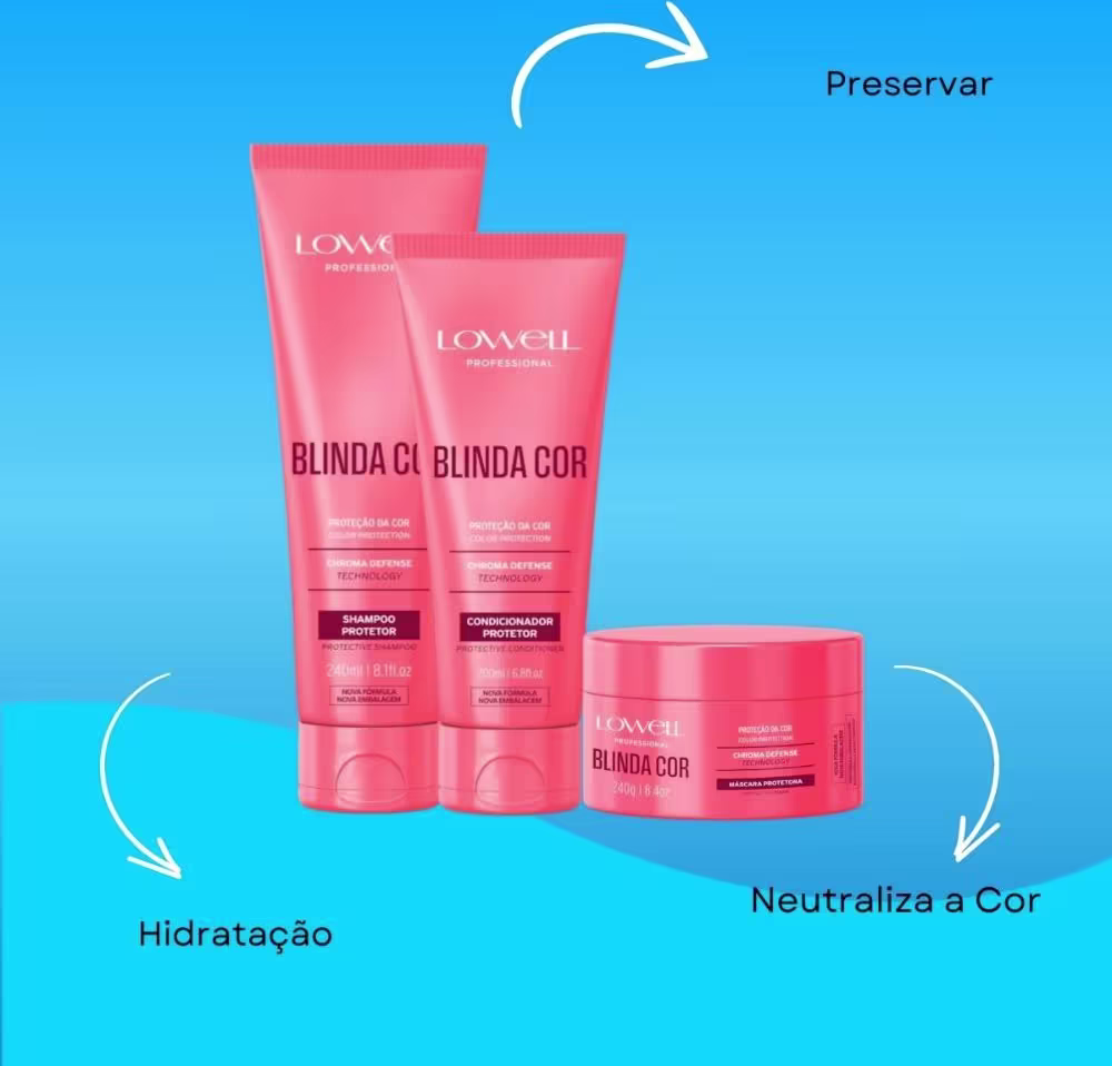 O Shampoo Protetor Blinda Cor limpa suavemente os cabelos, removendo impurezas sem agredir os pigmentos da coloração. Sua fórmula contém a exclusiva Chroma Defense Technology, que mantém a cor intensa e o cabelo hidratado por mais tempo, proporcionando brilho e maciez desde a primeira lavagem. O Condicionador Blinda Cor hidrata profundamente os cabelos, selando as cutículas para manter os pigmentos da coloração no interior da fibra capilar. Além disso, forma uma barreira protetora contra agressões externas, como lavagens frequentes, poluição e radiação solar, mantendo o brilho e a maciez dos fios.