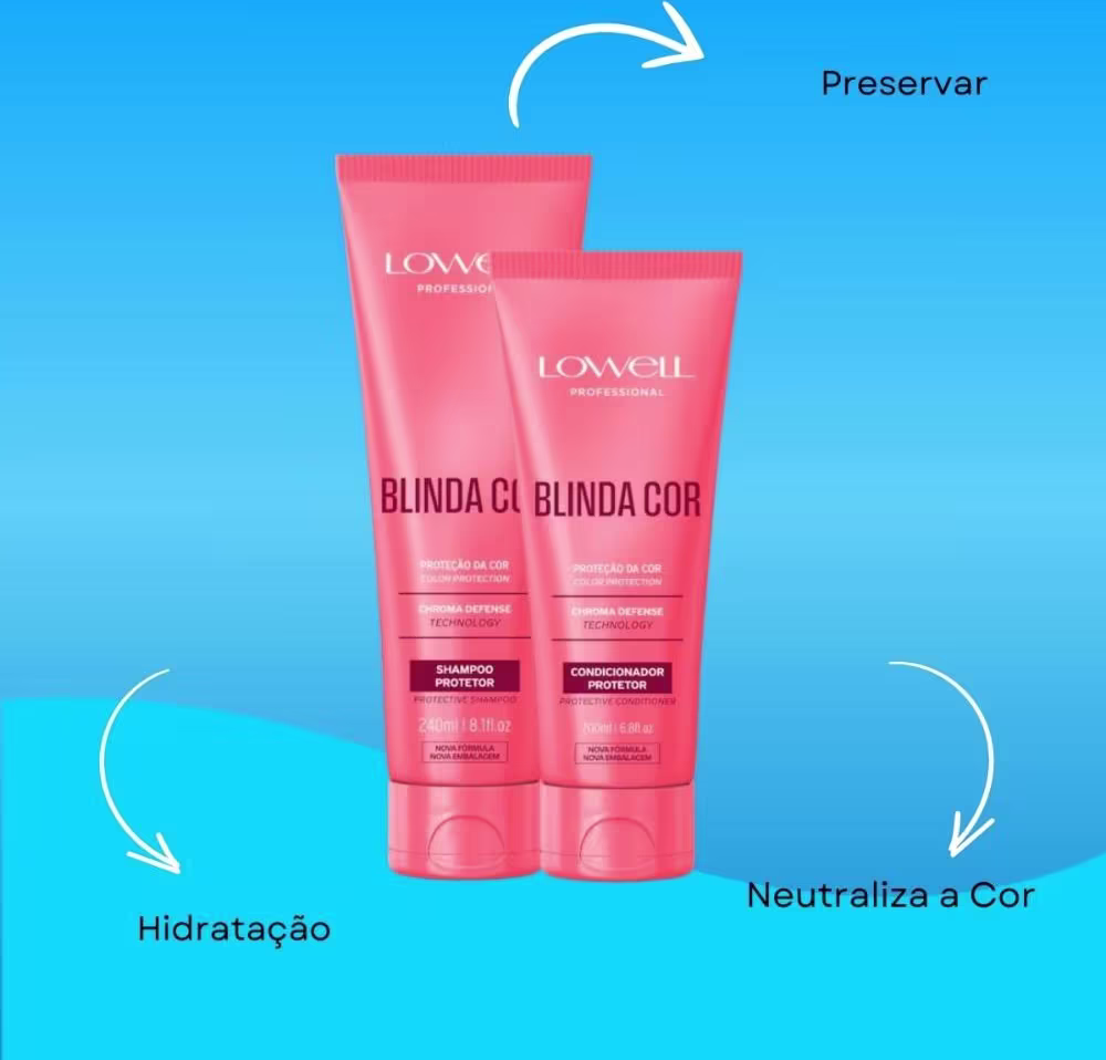O Shampoo Protetor Blinda Cor limpa suavemente os cabelos, removendo impurezas sem agredir os pigmentos da coloração. Sua fórmula contém a exclusiva Chroma Defense Technology, que mantém a cor intensa e o cabelo hidratado por mais tempo, proporcionando brilho e maciez desde a primeira lavagem. O Condicionador Blinda Cor hidrata profundamente os cabelos, selando as cutículas para manter os pigmentos da coloração no interior da fibra capilar. Além disso, forma uma barreira protetora contra agressões externas, como lavagens frequentes, poluição e radiação solar, mantendo o brilho e a maciez dos fios.