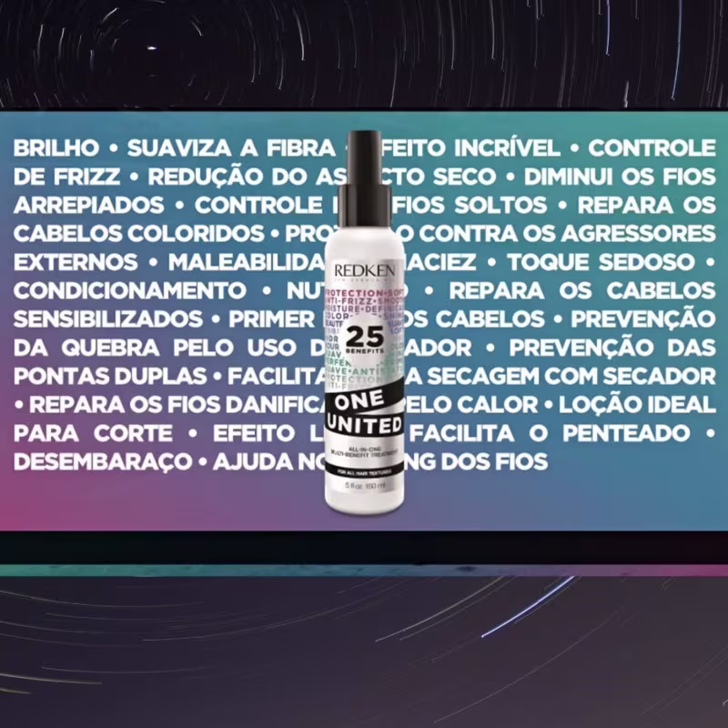 Tratamento Multibenefícios para todos os tipos de cabelo. Redken One United 25 Benefits oferece, como o nome mesmo diz, 25 benefícios instantâneos para fios macios, com brilho, protegidos do calor térmico, sem frizz e com efeito duradouro.