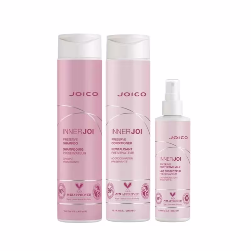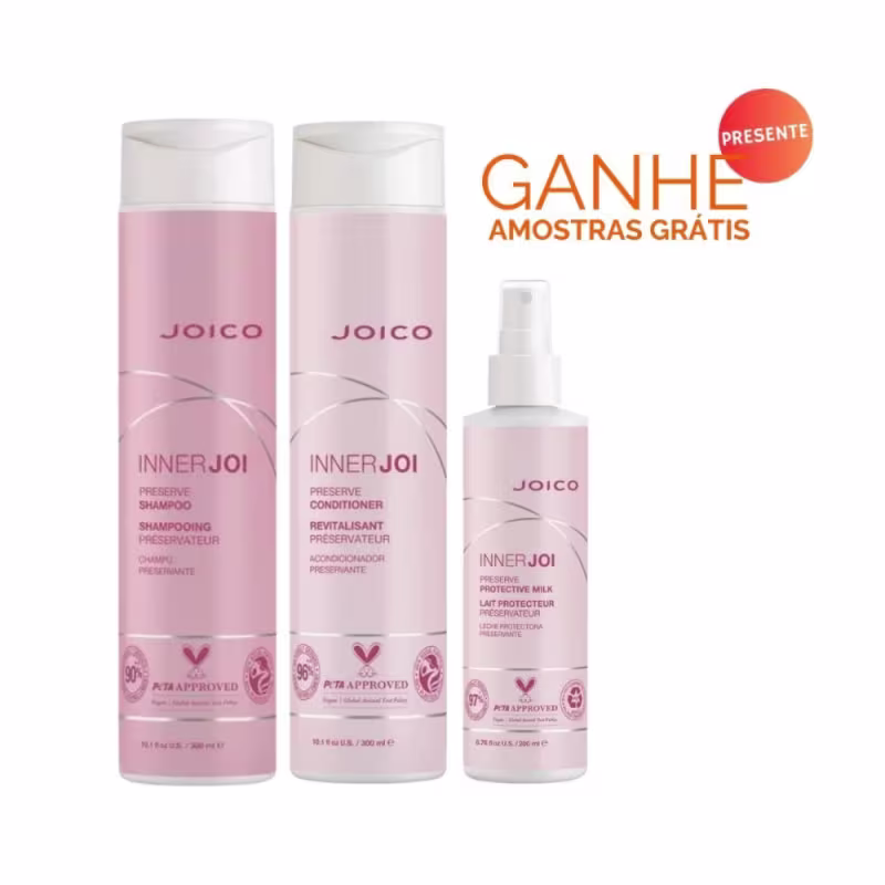 O Kit Joico Innerjoi Preserve é ideal para cabelos coloridos que precisam de cuidados especiais para manter a cor vibrante por mais tempo. Com uma fórmula vegana e enriquecida com antioxidantes naturais, ajuda a proteger contra os danos causados pelos radicais livres e a minimizar o desbotamento. O shampoo limpa delicadamente sem retirar os pigmentos, o condicionador sela as cutículas e proporciona maciez, enquanto o leave-in cria uma barreira protetora contra agressões externas como poluição e ferramentas térmicas. Se você busca manter a intensidade da sua cor e a saúde dos fios, este kit é a solução completa para brilho, força e durabilidade da cor.