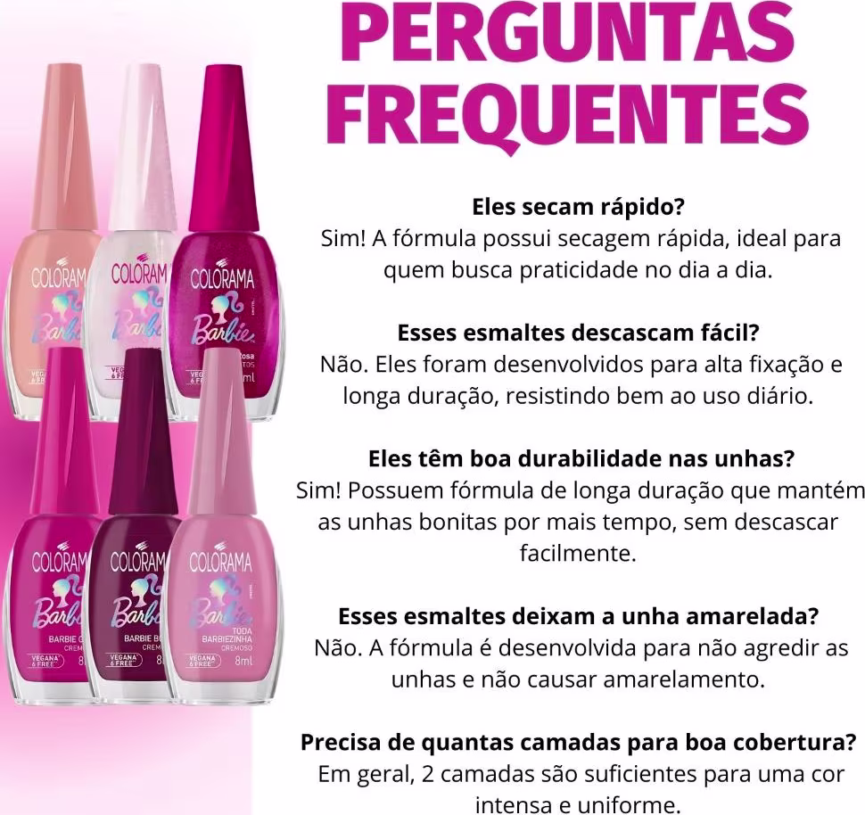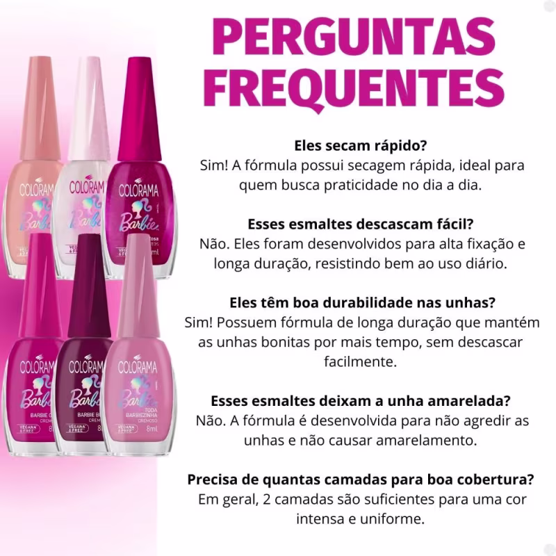 Cores icônicas da Coleção Barbie para expressar sua individualidade. * Alta pigmentação para unhas vibrantes e cheias de atitude. * Fórmula de longa duração para unhas impecáveis por mais tempo. * Secagem rápida para facilitar a aplicação e evitar borrões. * Esmaltes veganos e cruelty-free, cuidando das suas unhas e do meio ambiente.