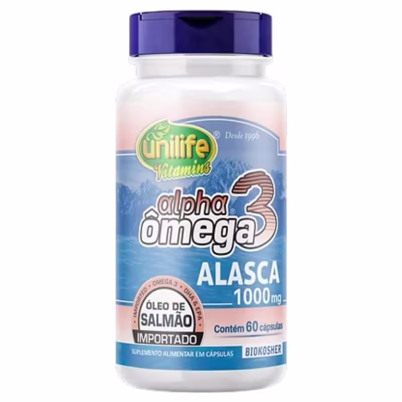 Alpha Ômega 3 Alasca 1000mg é um suplemento alimentar desenvolvido a partir da extração do óleo de salmão selvagem, de águas profundas e frias do Alasca.