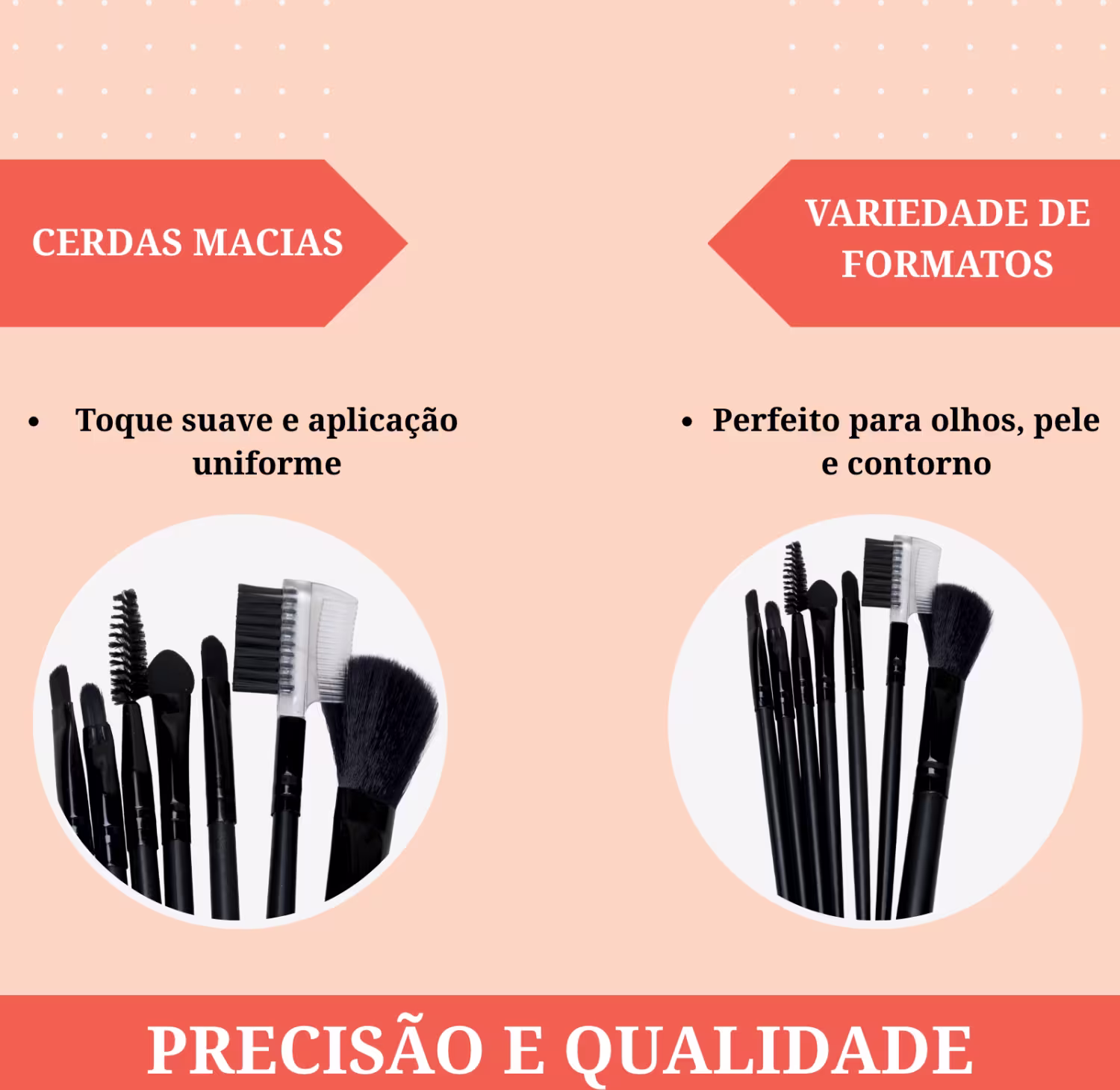 O kit inclui pincéis e aplicadores para diferentes finalidades, desde a aplicação de base e pó até o esfumado de sombras, além de escovinha e pente para sobrancelhas e cílios. As cerdas macias proporcionam um acabamento uniforme, enquanto os cabos leves garantem conforto no uso.