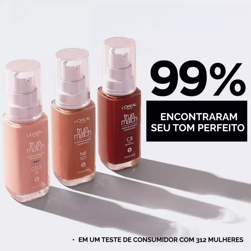 A base líquida L'Oréal Paris True Match Super-Blendable Foundation proporciona uma cobertura média com acabamento natural, adaptando-se perfeitamente ao tom e subtom da sua pele. Sua fórmula vegana é livre de álcool, óleos, fragrâncias e é não comedogênica, tornando-a adequada para todos os tipos de pele, incluindo as mais sensíveis.