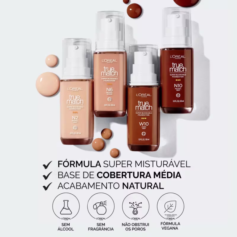 A base líquida L'Oréal Paris True Match Super-Blendable Foundation proporciona uma cobertura média com acabamento natural, adaptando-se perfeitamente ao tom e subtom da sua pele. Sua fórmula vegana é livre de álcool, óleos, fragrâncias e é não comedogênica, tornando-a adequada para todos os tipos de pele, incluindo as mais sensíveis.