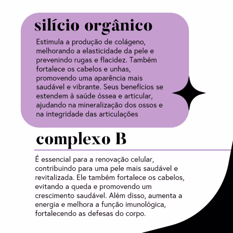 Sua fórmula combina silício orgânico para estrutura e firmeza, ácido hialurônico para hidratação e viço, e complexo B para regeneração celular.
