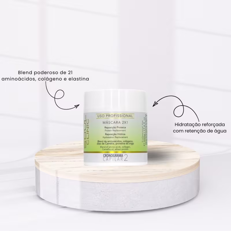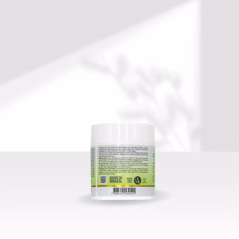 Ação:A Máscara Capilar 2x1 Soul Clinic oferece um tratamento intensivo 2 em 1, unindo os benefícios da nutrição e da reconstrução capilar em uma fórmula exclusiva. Rica em aminoácidos, manteigas vegetais e ativos hidratantes, ela repara os danos da fibra capilar, sela as cutículas e recupera a vitalidade dos fios.