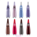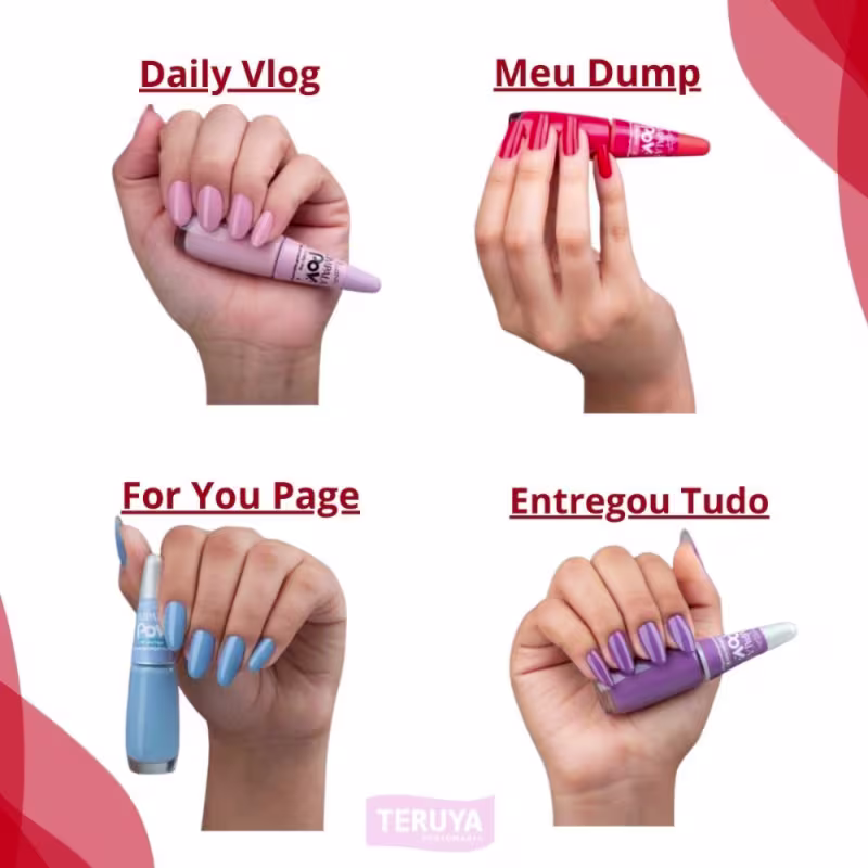 Kit contém 8 esmalte: 1 Arrume-se Comigo, 1 Meu Dump, 1 Daily Vlog, 1 Clean Girl, 1 Look Do Dia, Minha Vibe, 1 For You Page e 1 Entregou Tudo