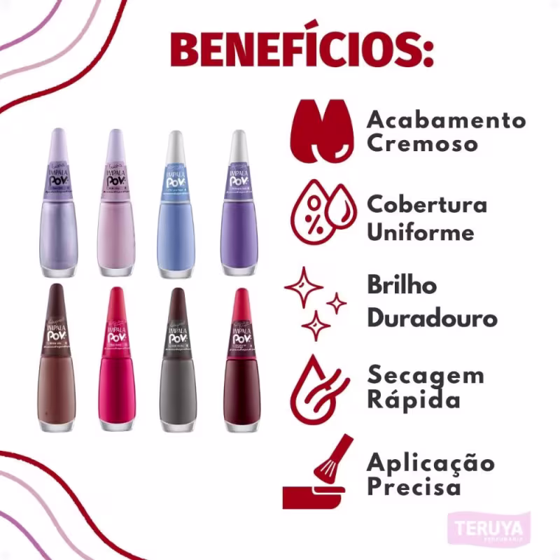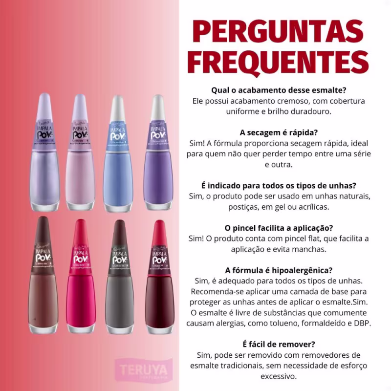 Fórmula 5-Free e Vegana: Livre de Tolueno, Formaldeído, DBP, Cânfora e Resina de Formaldeído, além de ser 100% vegano e não testado em animais.