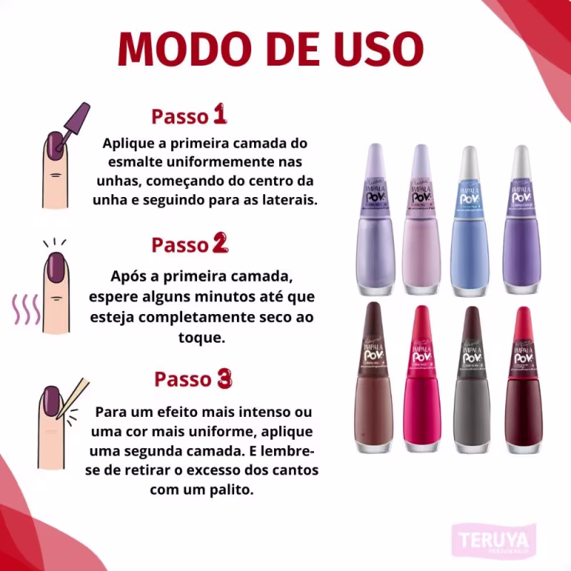 Finalize: Aplique um top coat para dar brilho e selar a cor. Para um resultado ainda melhor, utilize produtos da mesma linha Impala.
