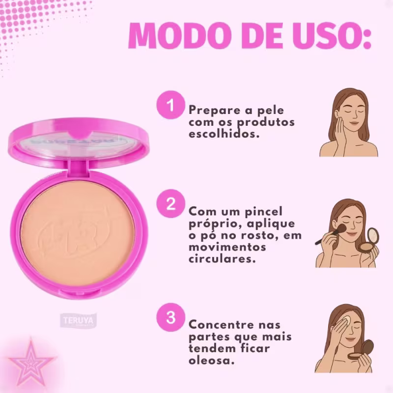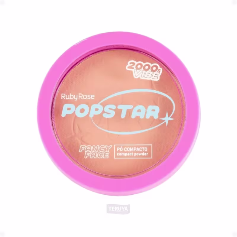 Aplique o Pó Compacto Ruby Rose Popstar Fancy Face P30 sobre a pele limpa e hidratada, após a aplicação da base e corretivo.