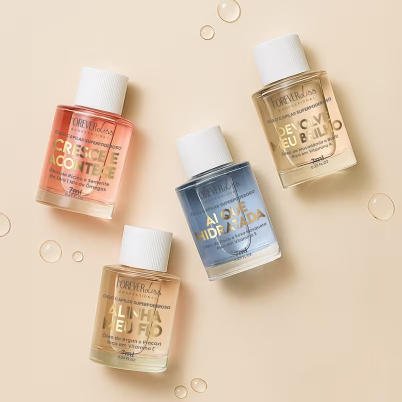O Kit Óleos Capilares Superpoderosos completo Forever Liss 7 ml é o melhor parceiro para a mulher que assume o papel de heroína da rotina. Perfeitos para o dia a dia, eles são ultraleves, versáteis e possuem fragrâncias especiais que podem ser combinadas para criar um perfume exclusivo. Cada óleo foi desenvolvido unindo ativos consagrados no skincare, como as vitaminas A e E, ao que há de mais moderno na tecnologia capilar. Essa união resulta na solução imediata do ressecamento e opacidade dos fios. IndicaçãoO Kit Óleos Superpoderosos completo Forever Liss 7 ml é perfeito para todos os tipos de cabelos, especialmente aqueles que estão ressecados, sem brilho, fragilizados e com frizz. Modo de usoBasta aplicar de 2 a 3 gotas de qualquer um dos Óleos Superpoderosos nas mãos e espalhar pelo comprimento dos fios secos ou úmidos, evitando a raiz. Não é necessário enxaguar. Também é possível misturar algumas gotas da versão escolhida na sua máscara de tratamento favorita. Outra forma de uso é como pré-shampoo, antes da lavagem. Você ainda pode misturar fragrâncias e criar combinações exclusivas. Contém01 - Óleo Capilar Superpoderoso Ai que Hidratada Forever Liss 7 ml01 - Óleo Capilar Superpoderoso Alinha Meu Fio Forever Liss 7 ml01 - Óleo Capilar Superpoderoso Cresce e Aparece Forever Liss 7 ml01 - Óleo Capilar Superpoderoso Devolve Meu Brilho Forever Liss 7 ml PrecauçõesMantenha em local fresco, arejado e ao abrigo de luz. Manter fora do alcance de crianças e animais. Não ingerir. Uso externo. Em caso de contato com os olhos, enxágue imediatamente com água em abundância. Havendo irritação, suspenda o uso e procure orientação médica. Principais Dúvidas:01. Qual a frequência de uso dos Óleos Superpoderosos Forever Liss 7 ml?Todos os óleos da linha podem ser usados diariamente.02. Como posso utilizar os Óleos Superpoderosos Forever Liss 7 ml?Aplique algumas gotas diretamente nos fios secos ou úmidos. Também pode misturar à sua máscara favorita ou usar como pré-shampoo.03. Deixa o cabelo pesado?Não! As fórmulas foram desenvolvidas para serem ultraleves e de absorção imediata.04. Posso combinar diferentes Óleos Superpoderosos Forever Liss 7 ml?Sim! Você pode misturar suas versões favoritas e criar fragrâncias exclusivas.05. A fragrância permanece nos fios?Sim, cada óleo tem fragrância inspirada em perfumaria fina que permanece por muito mais tempo.