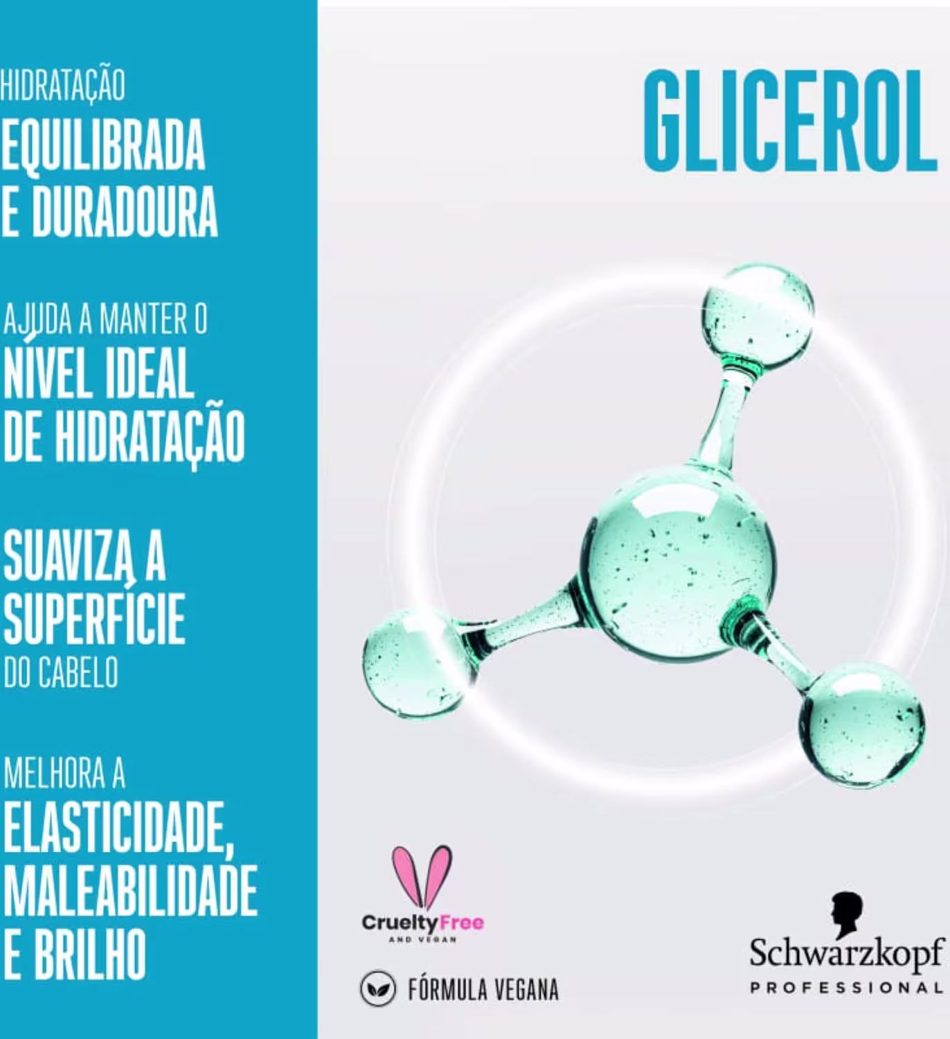 Glicerol: proporciona uma hidratação equilibrada e duradoura ao couro cabeludo e ao cabelo.