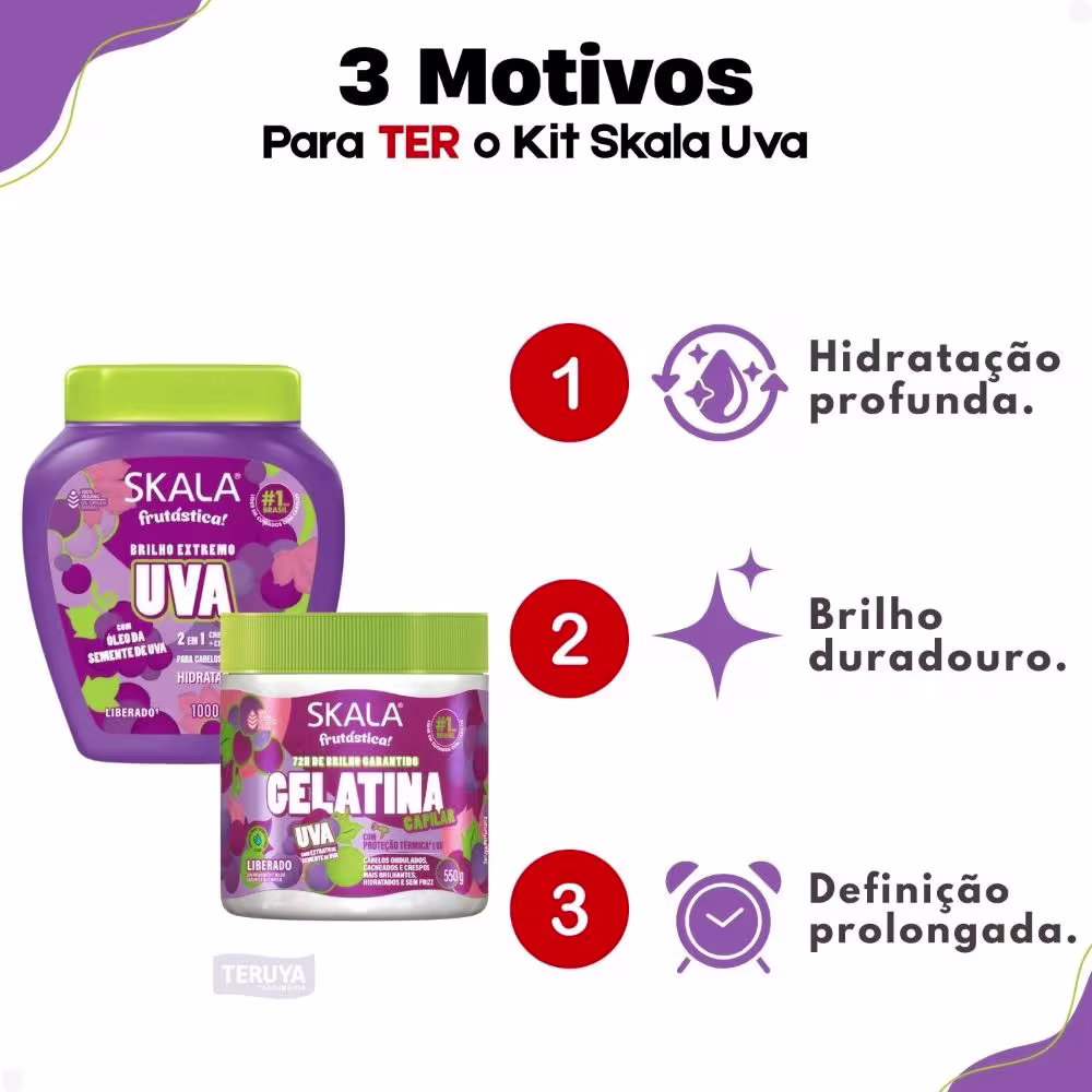 Não sei o CEPApresentamos o Kit Skala Frutástica Uva, a dupla perfeita para transformar seus cachos! Este kit inclui o Creme de Tratamento Frutástica Uva 1000g e a Gelatina Capilar Cachos 500g, desenvolvidos para proporcionar hidratação intensa, definição e vitalidade aos seus fios.